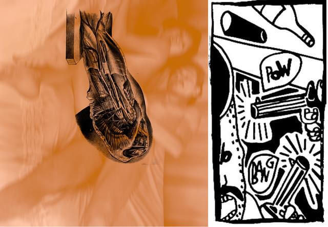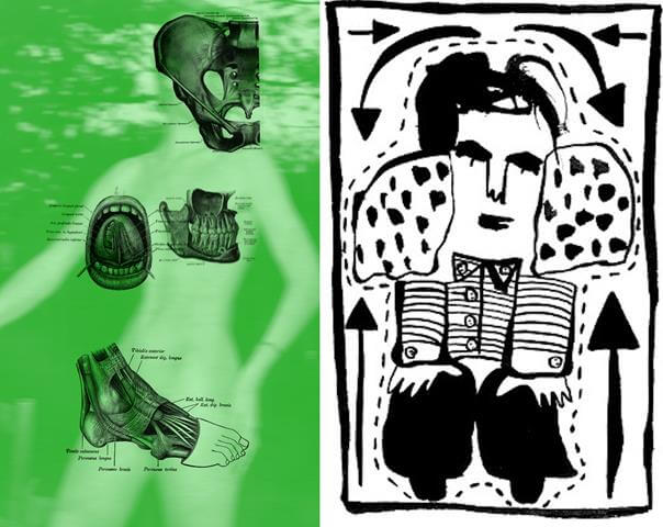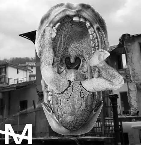 He has collaborated and he collaborates with many bands of industrial music like noise, experimental and electronic, harsh&death&metal gore, punx. He has illustrated poems and stories&music of Gavin Burrows, Harry Wilkens, Vittorio Baccelli, Claudio Morici, Alberto Rizzi, Cristiano Quadalti, ’’L’Agnello Sacrificale e la Salamandra Impiccata al Patè 666’’(Medicina Nucleare-Italy), and more.