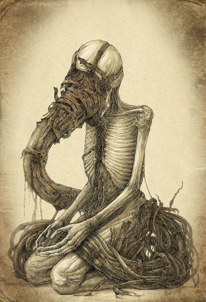 Kirill Semenov was born in Russia. He specializes in various original creepy drawings. He likes to draw since the earliest year. In time drawing became his passion and now he can’t imagine his life without it. It so happens that his art appears grim and dark, but as he says, he is sure there is the light even in the darkest places. He creates scenes of death that are full of grim beauty. Just using lines, he is able to convey so much emotion and despair in each of his pieces. Staring at his work inspires me to go deeper into my morbid brain, and take part in my own ritual of torment.