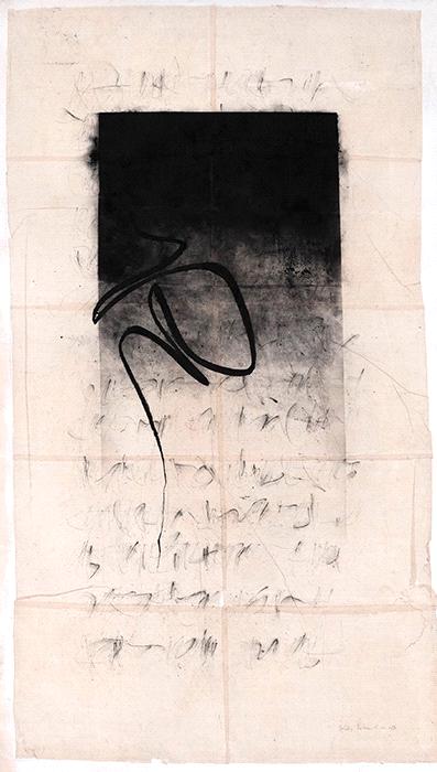 Kitty Sabatier was born in 1959 and lives in Toulouse, France, where she trained at the Fine Art School and at Bernard Arin’s Scriptorium. She opened her first atelier with Michel Derre in 1986 and published Cher maître, Lettres de Rilke à Rodin (Alternatives) in 2002. She worked in Paris as a graphic designer for the publishing and communications industry. Some of her works are called “Failles” and “Equilibres” and indeed they make us dizzy as we are swept into a labyrinth of light and shade, thrown off balance by dazzling whites surrounded by blocks of black or blue, and we get lost in unlikely charts of enigmatic signs. Probing the body of the letter to its bony skeleton, Kitty uses her immense talent to create spaces that vibrate with matt or velvety blacks and blank landscapes crossed by a streak of ink. Currently, Kitty teaches calligraphy and typographic drawing. She also freelances as a graphic designer, and regularly shows her works at exhibitions.