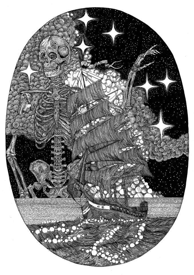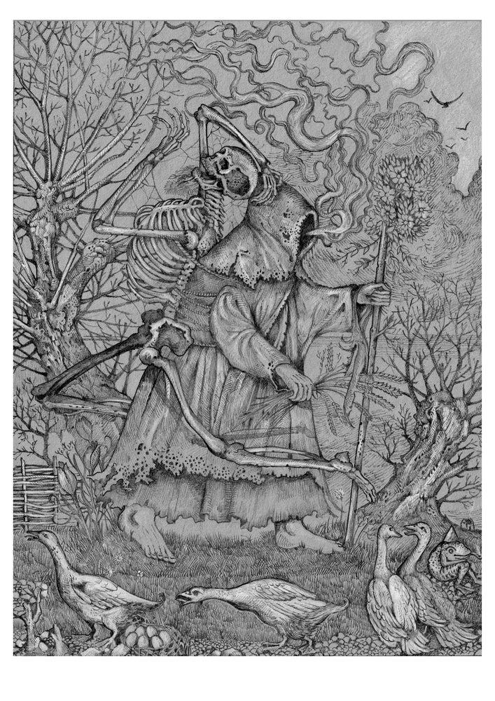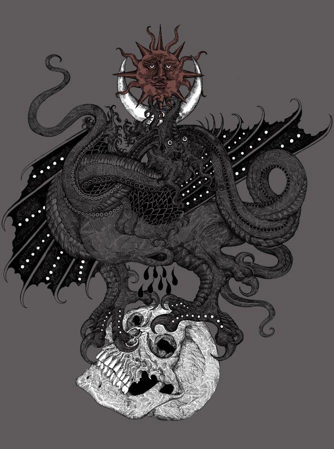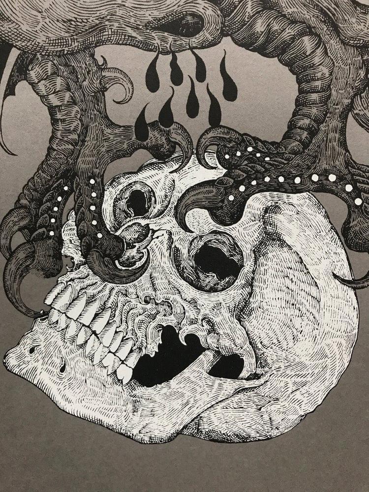 Sin-Eater is a UK-based artist who draws murky scenes of ancient beasts and the dark arts. The name “Sin-Eater” comes with its own fascinating mythologies. From Mesoamerica to the English countryside, the concept has arisen in folklores across the world, referring to people who eat or drink the sins of a deceased person, thereby purifying the spirit’s soul. A cynic of photoshop all of his artwork is created by hand. His desire is for Sin-Eater to belong among the Albrecht Durers. His artwork hearkens back to these ritualistic practices, using a traditional medium and ancient imagery to figuratively dissolve the “sins” of humanity across time and space.