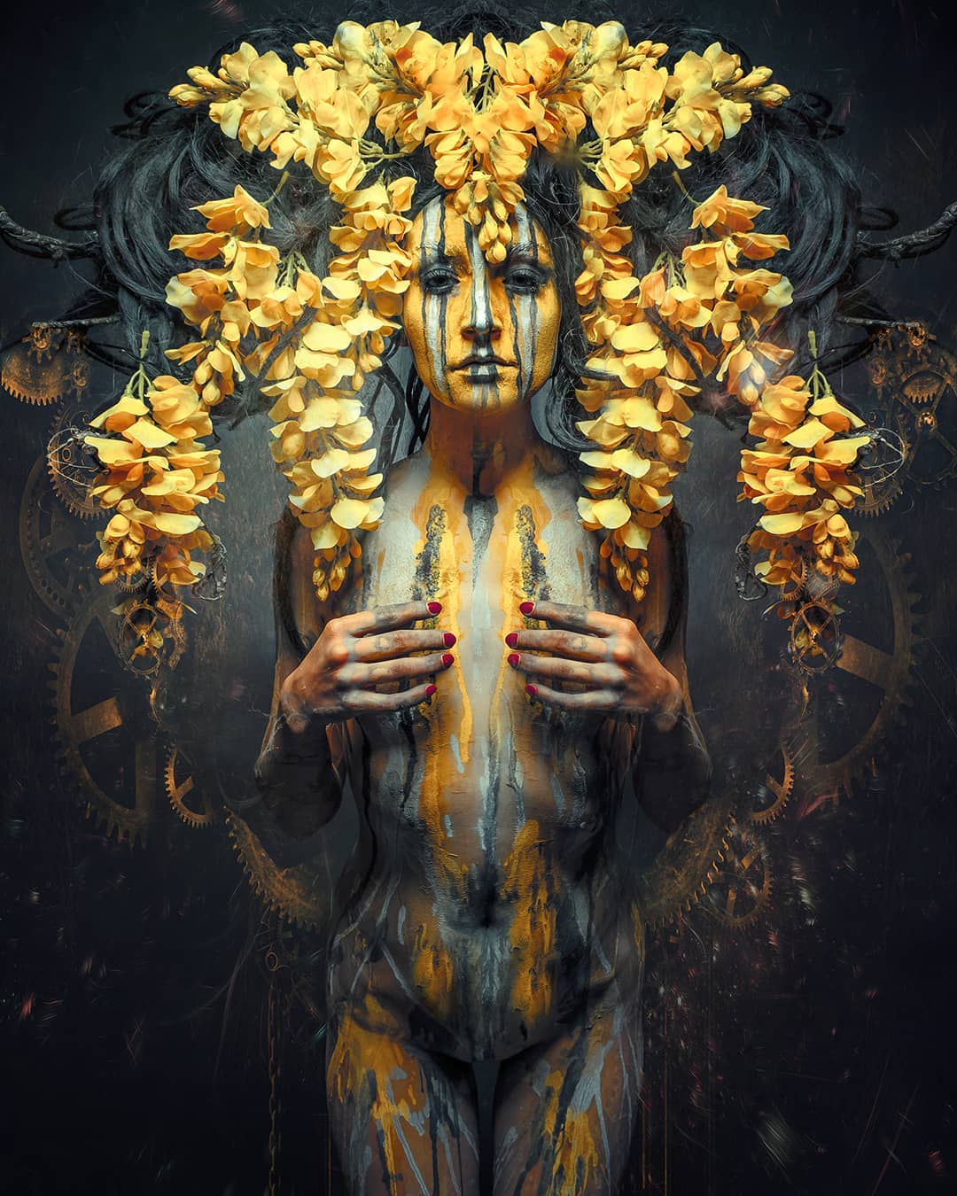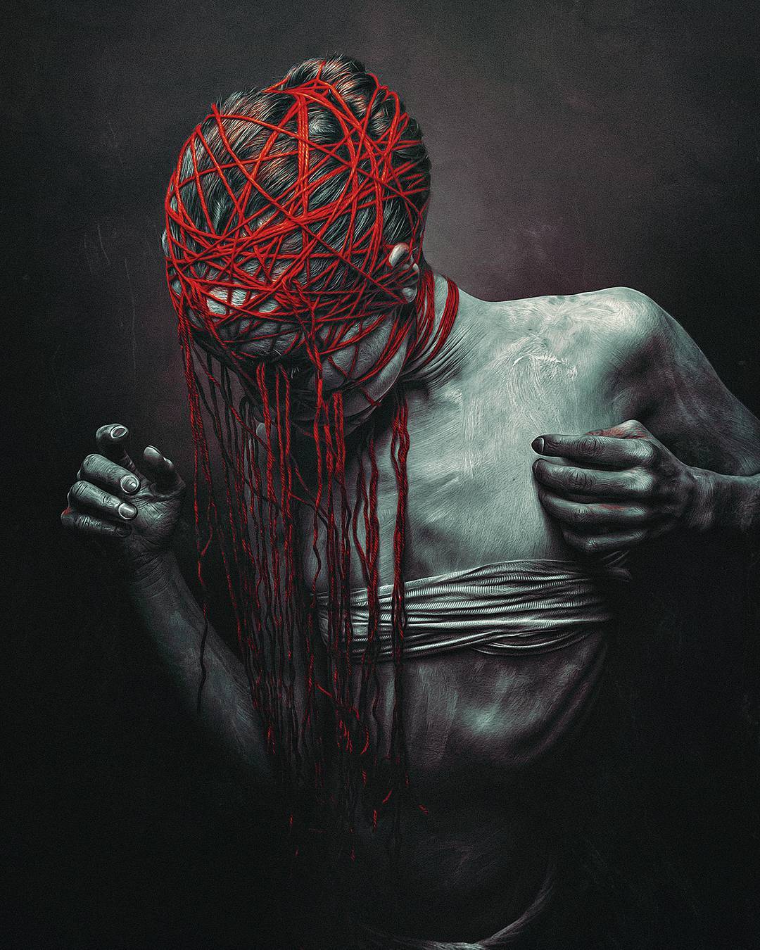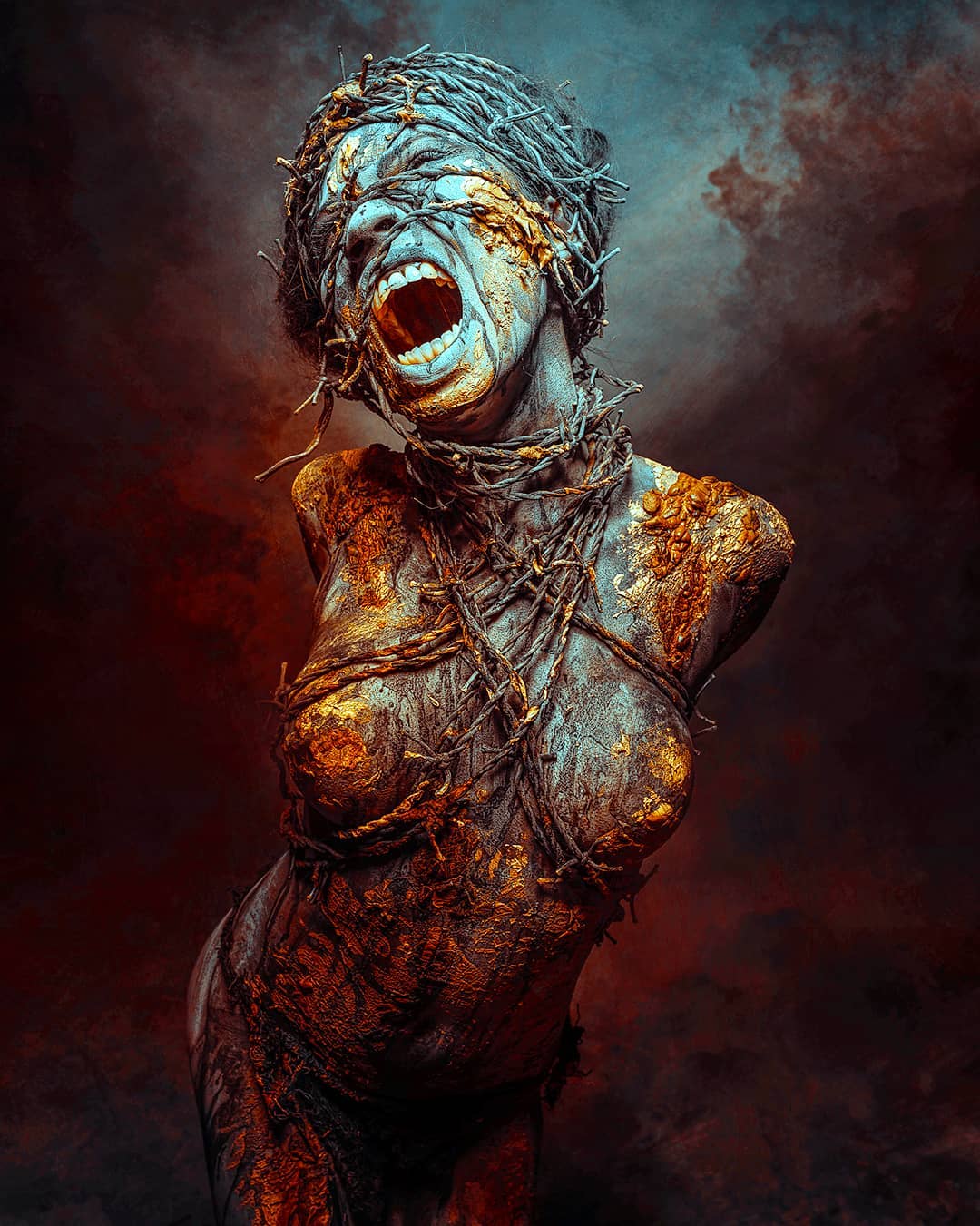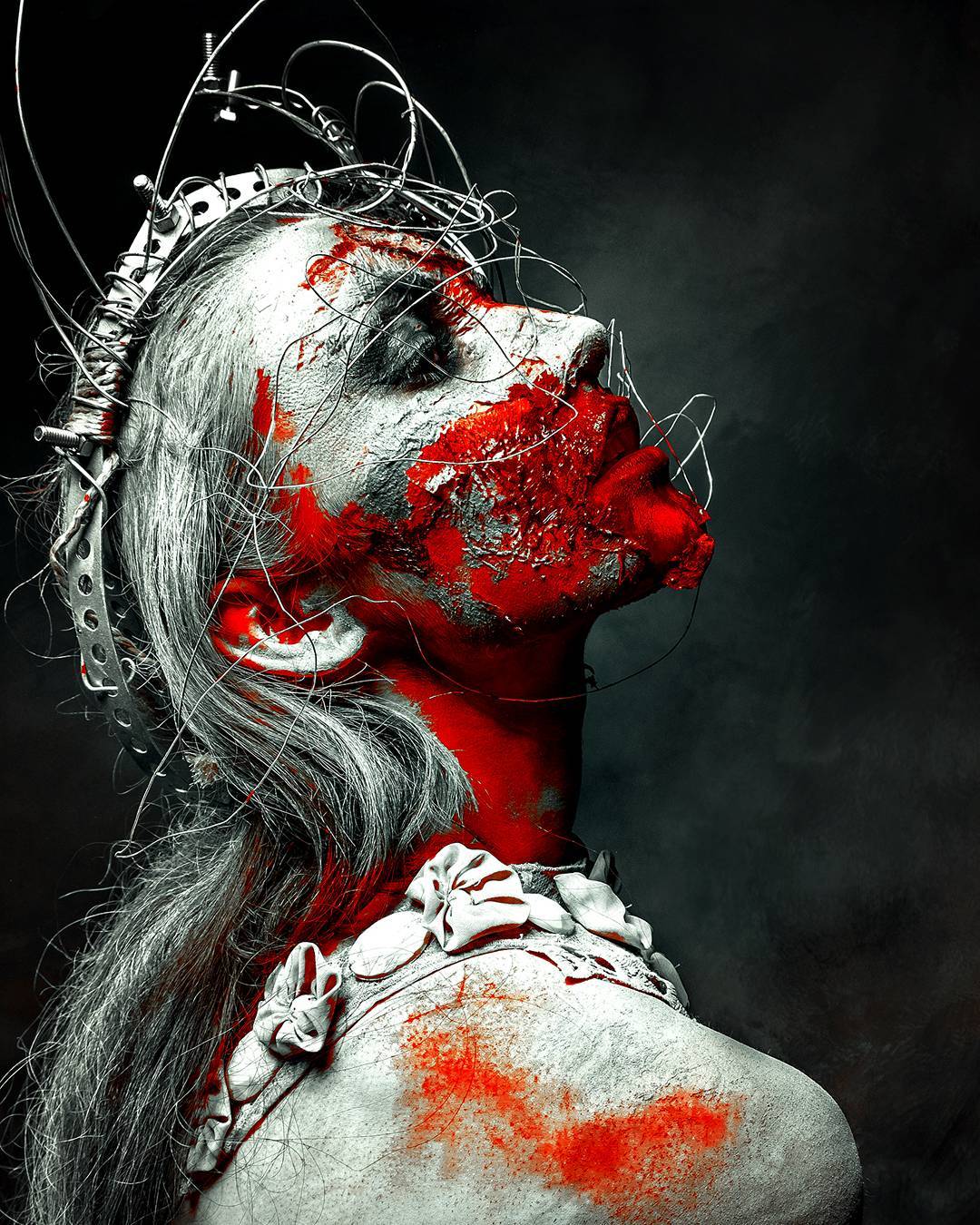 Stefan Gesell is a photographer who was born in Markshorrgast/Kulmbach and now lives in Munich. He started photography in 2005 with a 3 megapixel Pentax – before that time he just took some pictures on vacation with a small “pocket camera”. He was and still is inspired by H.R.Giger, Helnwein and Jan Saudek. His creations are unsettling, sometimes violent, he draws from imaginations of the masters of comics who so often found life much more real via the cinema. Stefan, transforms his model, whether it is a man or a woman. He pushes the models so that they have to be expressive in their glances, in the distortions of their bodies. Dark, confident, and even tortured figures confront the viewer with tremendous strength, each seemingly imbued with otherworldly knowledge and power.